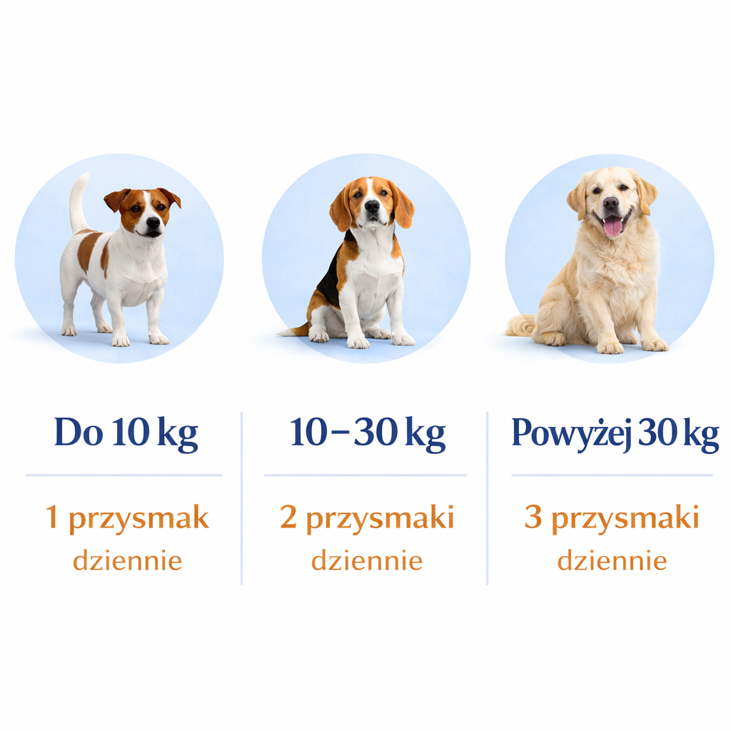 Wcześniej unikał schodów po dłuższym spacerze. Teraz porusza się pewniej i ma więcej energii. Duży plus za formę przysmaków - żadnego ukrywania w karmie.